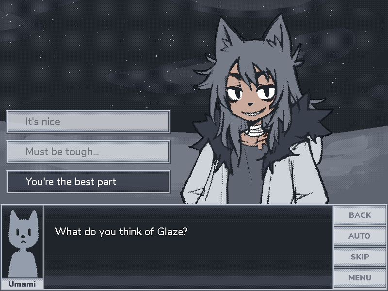 I had so many thoughts when I was playing but now that I'm here I just want to put my head in my hands and scream, this was such a wonderful and richly felt experience. From the routes, to the music, to the characterization of Timber who I would go to war for!!! UGGHH this game single-handedly recharged my desire to seek out new stories and games again, because what if I pass by another "Night With Timber" just waiting for be felt!! Thank you for this game, dev, and I can only send my warmest wishes for you!!!